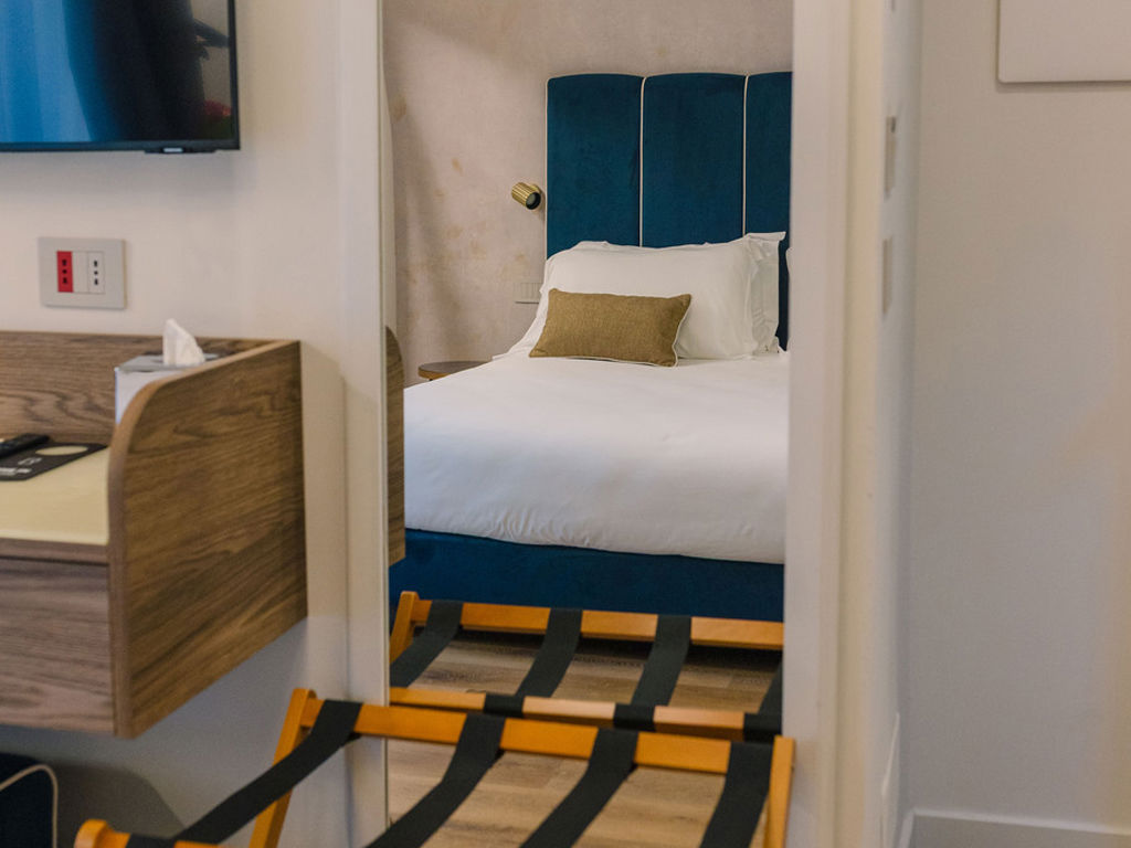 Elegante camera con balcone privato vista mare. Arredata con tessuti pregiati nei toni del beige Yucatan o rosso Meucci, letto king size, comfort moderni, macchina del caffè Illy, bollitore, un rifugio chic sul Golfo di Rapallo.