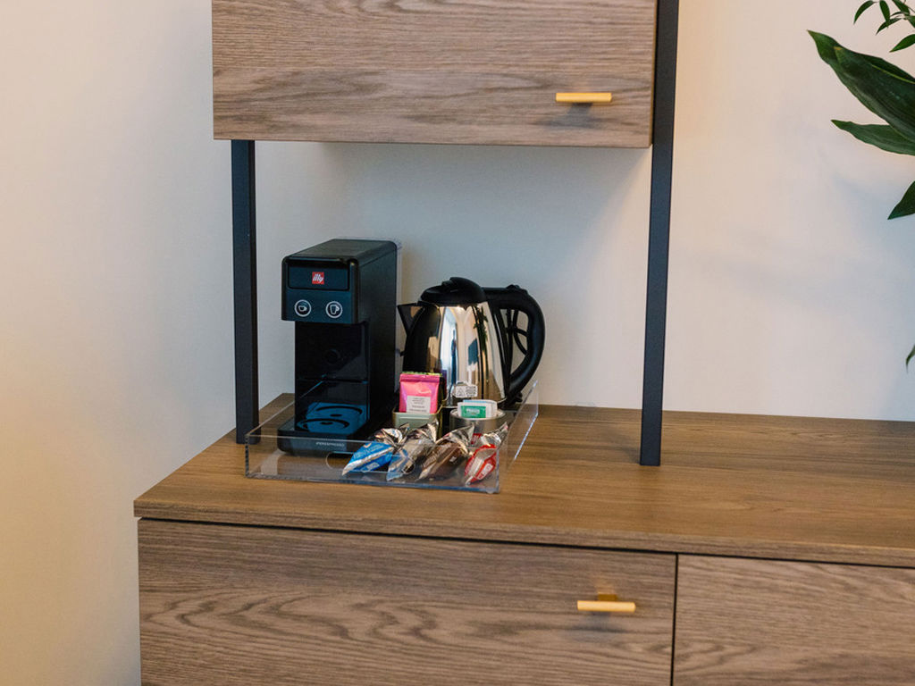 Fornita di macchina del caffè Illy e bollitore, per un comfort quotidiano.